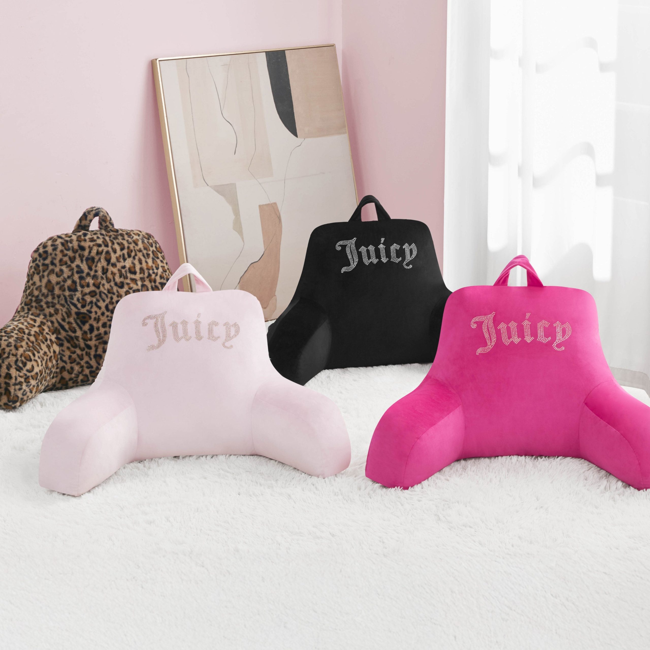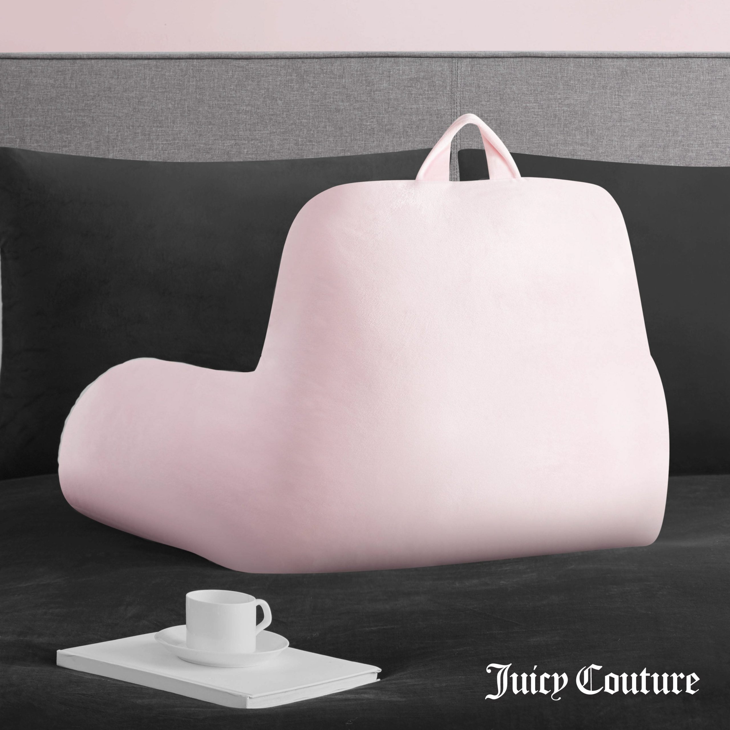 Lounge in style with the Juicy Couture Backrest Pillow measuring 30 x 17 x 17. Perfect for relaxing in bed or on the couch. Includes a side pocket for essentials and a top handle for easy carrying. Spot clean only.