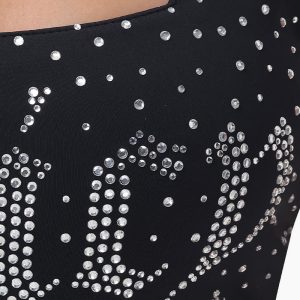 This sleek. figure-skimming bodysuit with a wide scoop neck is a perfect foundation for any outfit in your repertoire. Finished with our iconic rhinestone logo in the center.