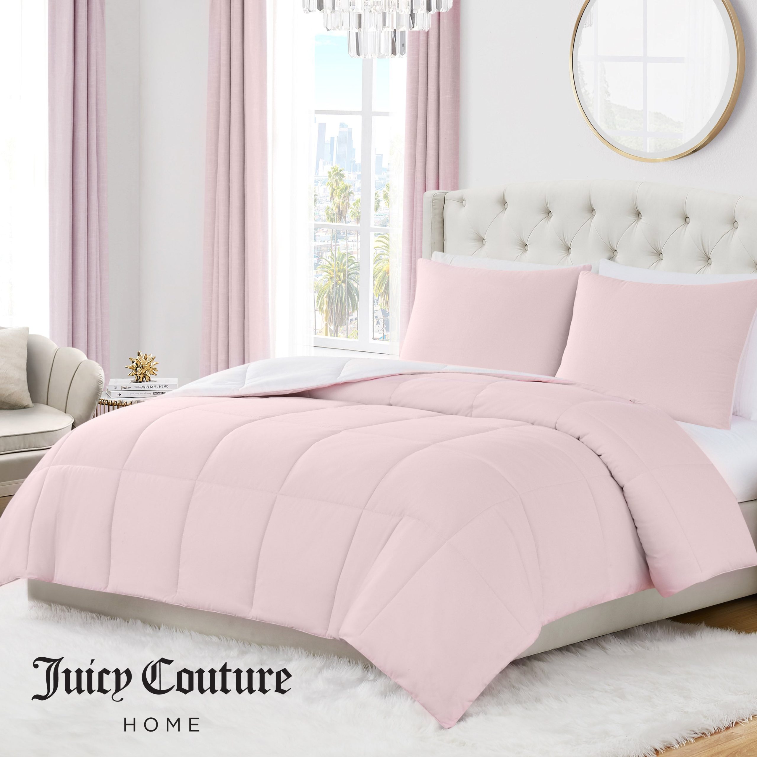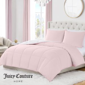 Bring signature Juicy Couture glam to your bedroom with this Reversible Comforter Set. Designed with a fashion-forward Box Stitch detail and crafted from ultra-soft. lightweight fabric. this set delivers both style and comfort in one. The reversible design offers two chic looks. letting you switch up your vibe anytime. Perfect for trendsetters. teens. and anyone who loves a touch of luxury. this glam bedding essential transforms any sleep space.