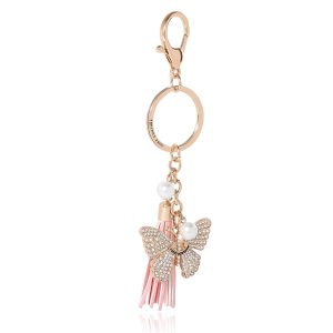 Make a stylish statement with the Juicy Couture Butterfly Charm Keychain. a stunning blend of elegance and femininity. Featuring a gold-tone butterfly charm adorned with crystal embellishments. this keychain adds a sophisticated sparkle to any bag. wallet. or key set. The delicate pearl accents and soft pink tassel enhance its charm. making it the perfect accessory for anyone who loves fashionable and luxurious details. The durable keyring and lobster clasp ensure secure attachment while adding a stylish edge. Whether as a gift or a personal style upgrade. this keychain is a must-have for fashion lovers.