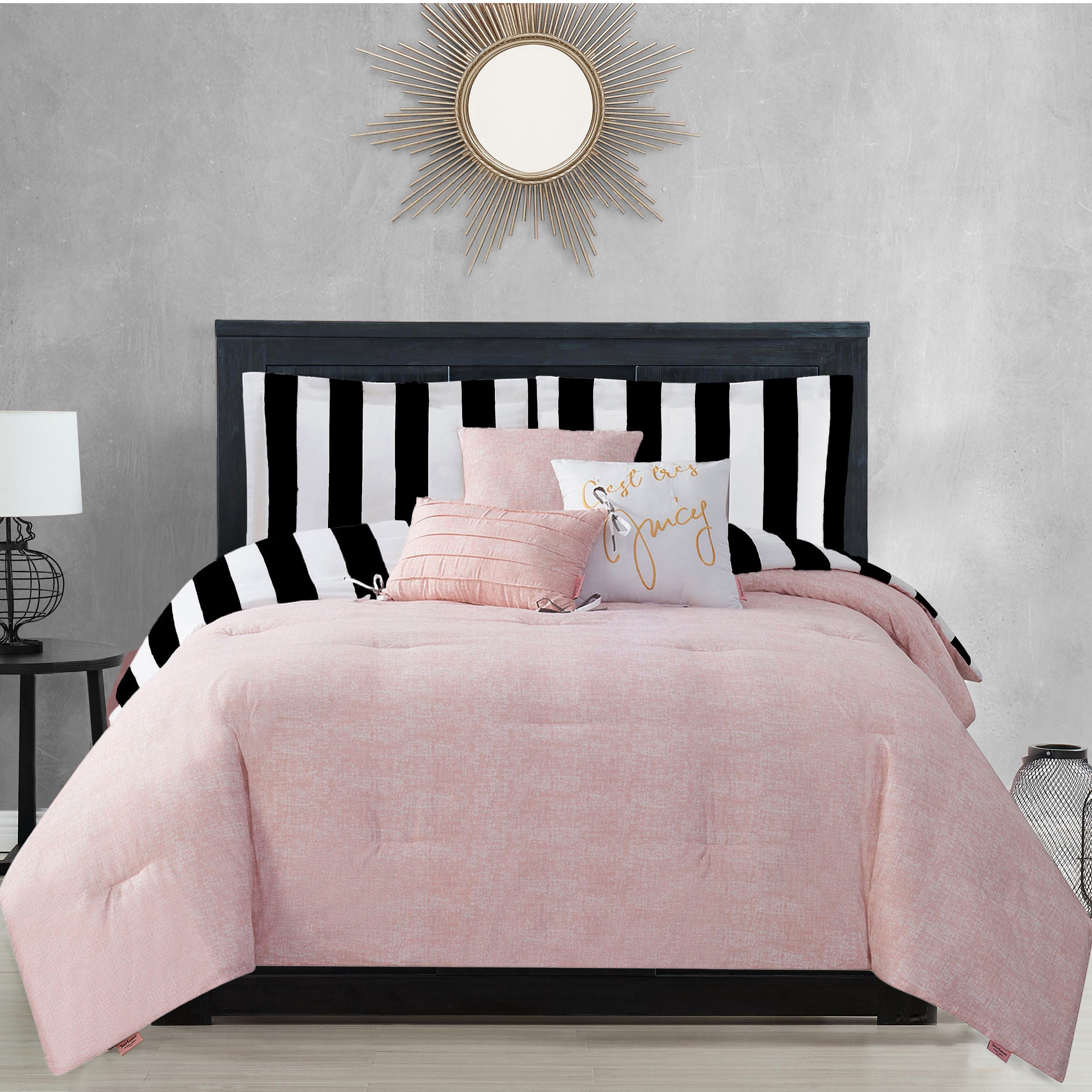 Bring effortless luxury into your bedroom with the Juicy Couture Cabana Stripe Reversible bedding set. This set features bold stripes with a distressed reversible print on super-soft fabric that makes this as comfortable as it is stylish. The bedding set comes with three fun decorative pillows that feature gold embroidery and pleats.