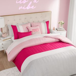 A bedding set that’s as vibrant and sophisticated as you are. This color-blocked comforter set features an eye-catching pattern. quilt stitching. and pleated texture for adding bold interest to your space. Plus. a square pillow with satin lettering and piping makes this an all-in-one bedroom makeover.