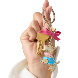 Cute and classic Juicy Couture. This goldtone keychain showcases a crystalstudded Scottie dog finished with a satin bow and textured split ring. Clip to your keys. tote or weekender for playful shine.
