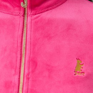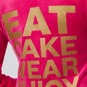 This luxe velour staple gets a festive twist with a glittery Eat Cake Wear Juicy graphic on the back and our signature bedazzled J zipper for extra shine. It’s playful. polished. and made for the life of the party ?aka you.
