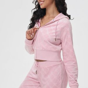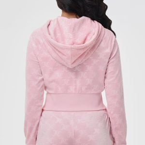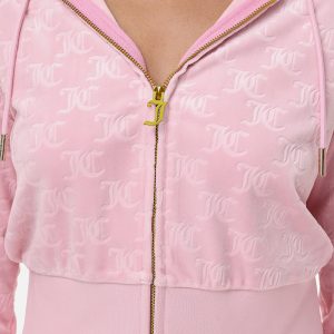 Plush velour offers exceptional comfort in this cropped hoodie distinguished with an all over embossed logo.