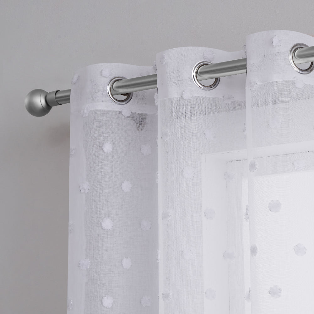 Elevate your decor with the chic and stylish Evelyn Sheer Pom Pom Embellished Window Curtain Panel Pair Collection by Juicy Couture. Rich. textured sheer panels feature an all-over pom pom embellishment that adds a playful whimsy to any bedroom. living room. dining room. or office space.