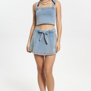This faux-knit denim tank top is a fun and clean layering piece to rock with our matching skirt or wear solo.