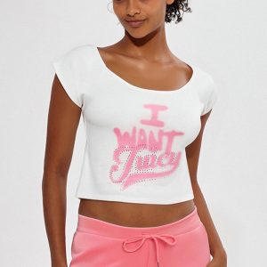 Turn heads in this off-the-shoulder top. dripping in rhinestones and attitude. The I Want Juicy graphic says it all??flirty. fierce. and totally irresistible.