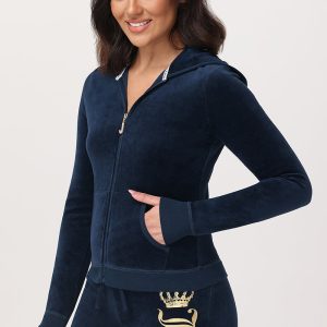 Returning to the roots of the brand. this long cotton velour hoodie features a crown rhinestone graphic on the back and is finished with the original ‘J’ zip pull for an authentic nod to the past.
