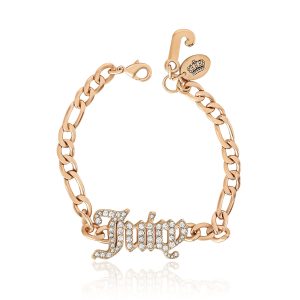 Make a bold statement with the Juicy Couture Crystal Script Logo Chain Bracelet. Featuring a luxurious Goldtone chain and the iconic Juicy logo encrusted with sparkling crystals. this piece effortlessly combines glamour with everyday style. Perfect for any occasion. this chic bracelet is your go-to accessory for elevating your outfit