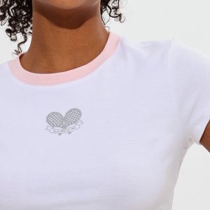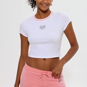 Juicy Anyone Crafted with a soft. cropped silhouette and casual ribbing. it offers a perfect fit for all sizes. This cropped ringer tee is the perfect addition to your wardrobe finished with a gliterry rackets graphic in the center.
