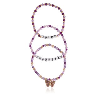 Shine like a true superstar with the Juicy Couture Superstar Beaded Bracelet Set. This stylish trio features three stretch-fit bracelets designed for effortless wear and vibrant style. One bracelet boasts JUICY in bold letter beads. another highlights SUPERSTAR. while the third showcases a dazzling butterfly charm. With a mix of pearlized. faceted. and gold-accented beads in purple and pink hues. this set is perfect for stacking or wearing solo. Comfortable and lightweight. these bracelets make the perfect gift for fashion-forward individuals who love to express their unique style.