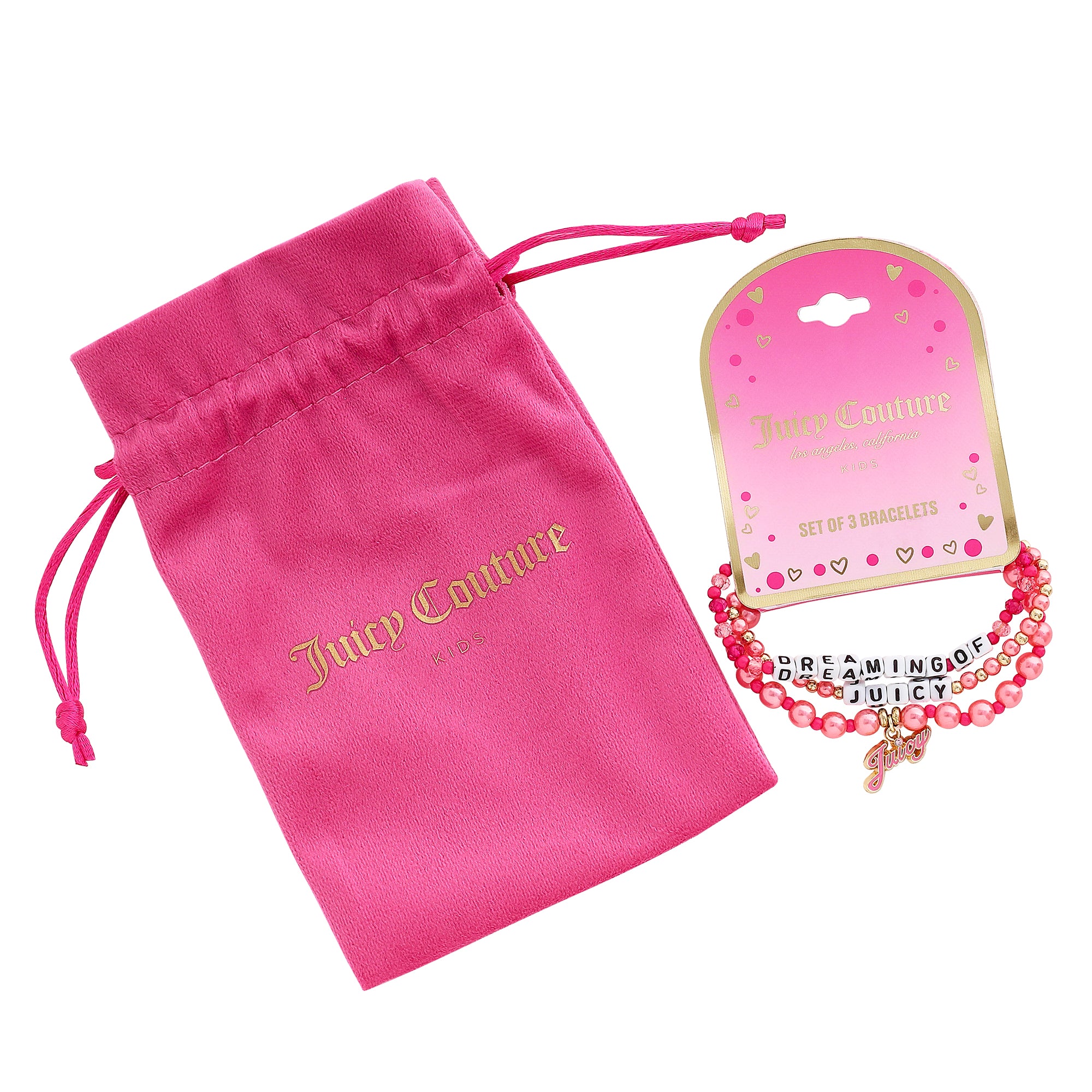 Express your love for iconic fashion with the Juicy Couture Beaded Bracelet Set. This trendy set includes three stretch bracelets featuring pearlized pink beads. gold accents. and stylish letter beads spelling out Dreaming of Juicy. Designed for comfortable. all-day wear. these stackable bracelets offer a mix of playful elegance and effortless charm. Whether worn individually or stacked together. these bracelets make a bold fashion statement. Perfect for young fashion lovers. this set is a must-have accessory for casual outings. parties. and gifting occasions.