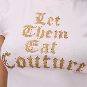 This cheeky crop features a glitter foil graphic that says Let Them Eat Couture. framed with a sparkling rhinestone outline.