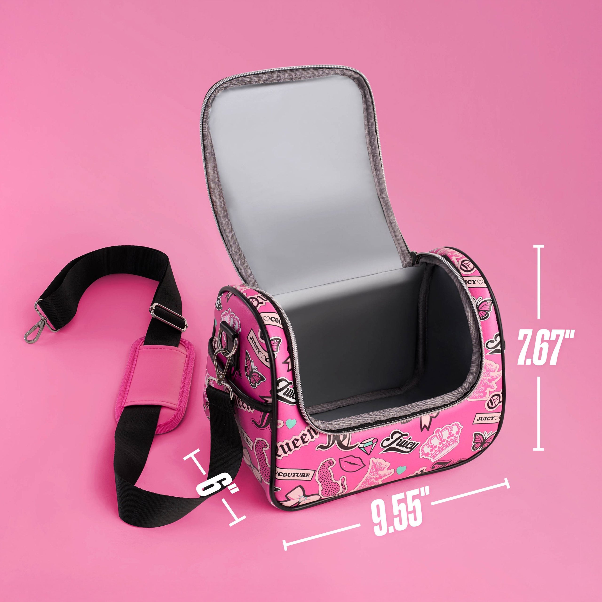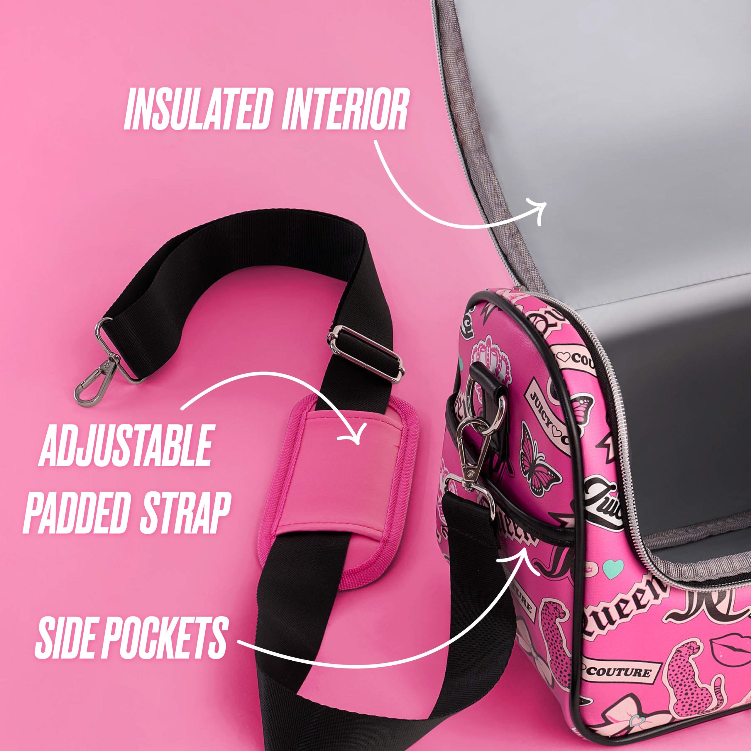 Stay stylish on the go with the Juicy Couture Lunch Purse Bag Cooler. featuring an embossed PU design. black trim. and signature Juicy flair. The insulated interior keeps your meals hot or cold. while the spacious compartment fits up to six cans with ease. Designed for convenience. it includes a top handle. adjustable padded strap. side pocket. and a cham zipper closure??perfect for work. school. or weekends out.