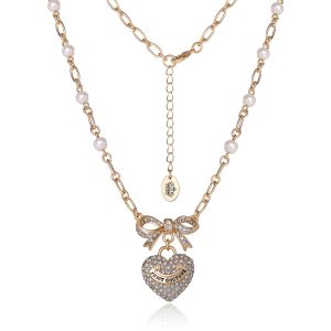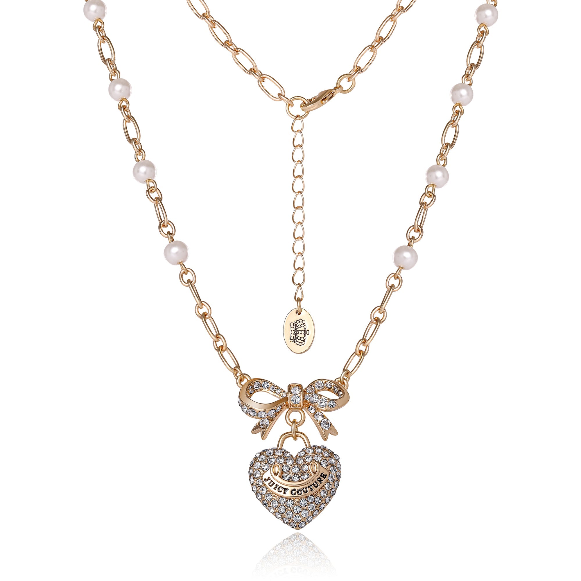 Elevate your elegance with the Juicy Couture Goldtone Pearl Heart Pendant Necklace. This stunning piece features delicate pearl accents along a chic Goldtone chain. with a sparkling heart pendant adorned with crystal embellishments and a dainty bow. Whether worn alone or layered. this necklace adds a timeless and glamorous touch to any outfit. Perfect for special occasions or everyday luxury.