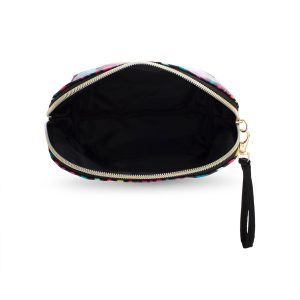 This rainbow zebra print juicy cosmetic wrist pouch is the perfect size to carry alone or fit inside your handbag.