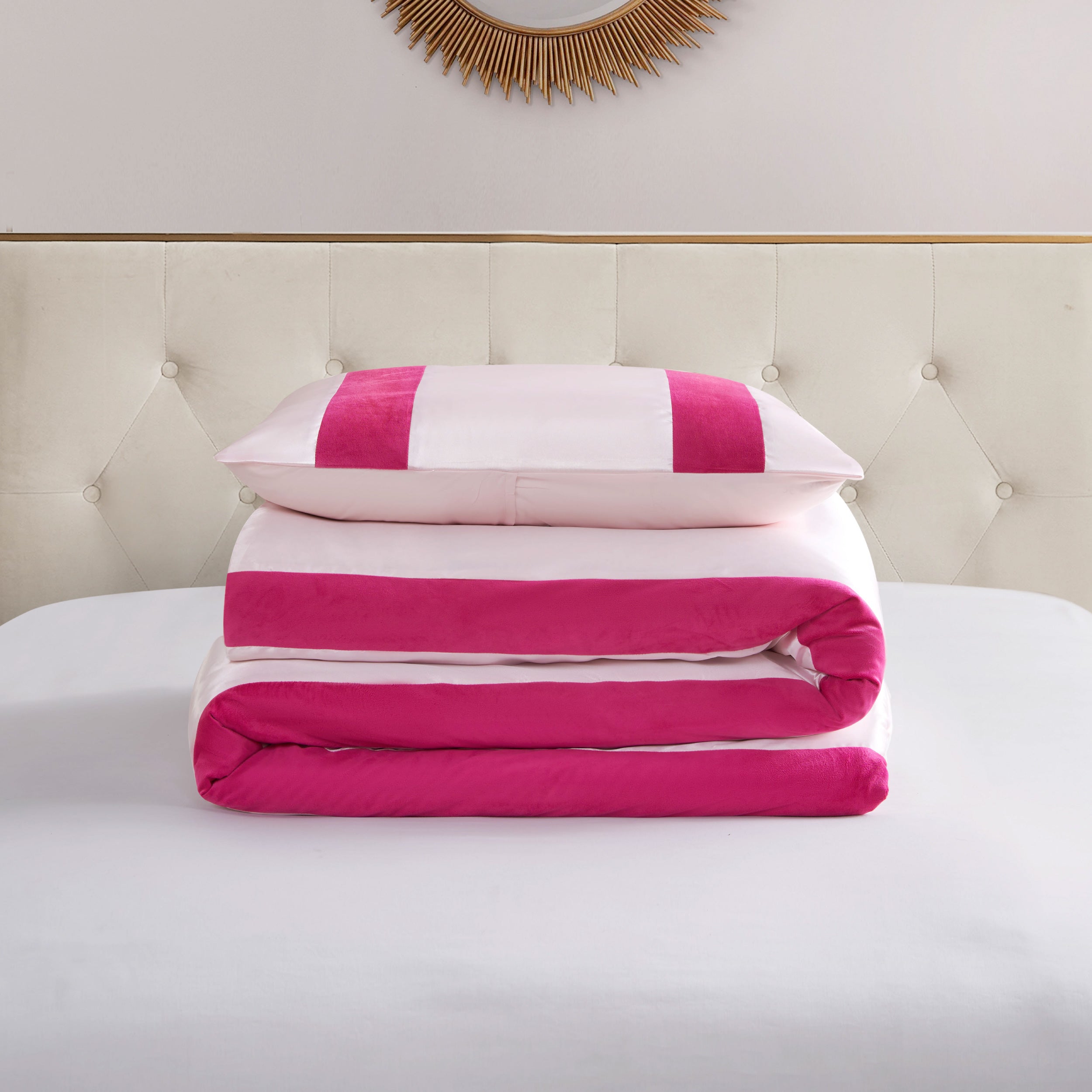 Turn any bedroom into a 5-star luxury hotel room with this sophisticated bedding set. This luxurious comforter and sham set combines smooth & lustrous satin with rich velvet stripes for a sophisticated yet soft vibe. Ready to give your space a high-end makeover