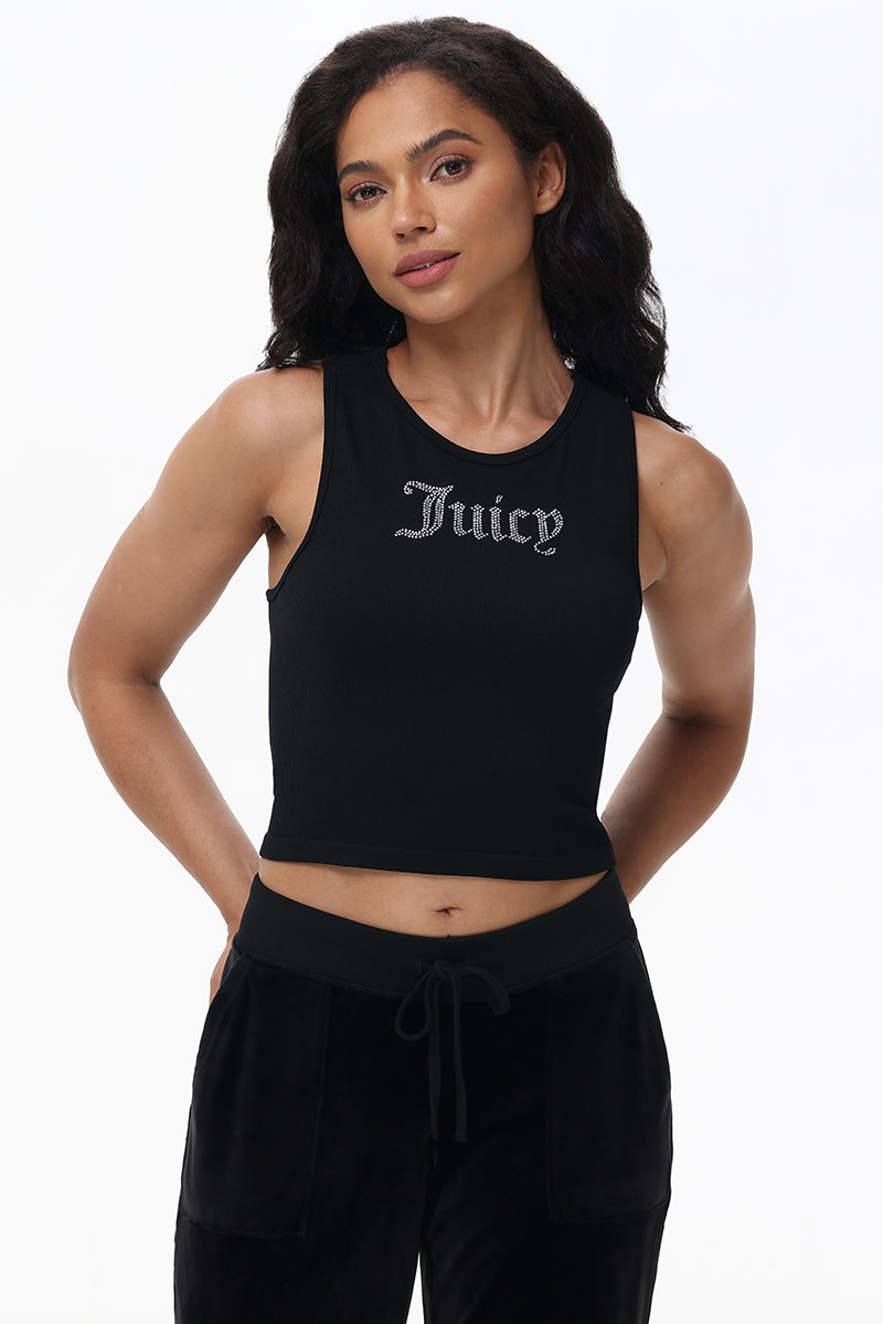 Introducing our cropped tank with a high neck in our new seamless fabric. Perfect for casual or gym wear. And check out that rhinestone logo! You’ll be sparkling in style.