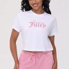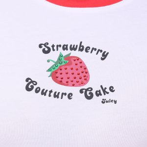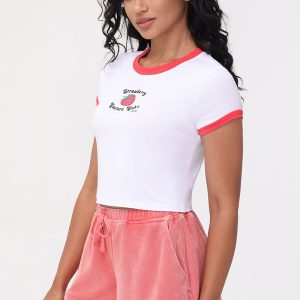 Crafted with a soft. cropped silhouette and casual ribbing. it offers a perfect fit for all sizes. This cropped ringer tee is the perfect addition to your wardrobe finished with a gliterry strawberries graphic in the center.