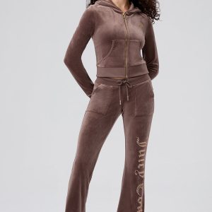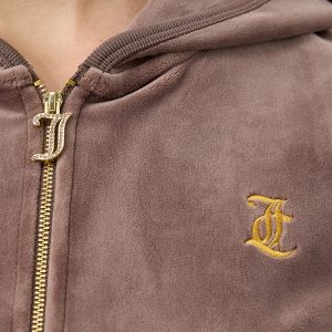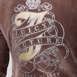 The ultimate throw-on-and-glow piece. Featuring a glittery back graphic with a bold J and the iconic phrase Thirty. Flirty and Juicy. this velour classic is finished with a rhinestone J zip puller for that extra sparkle.