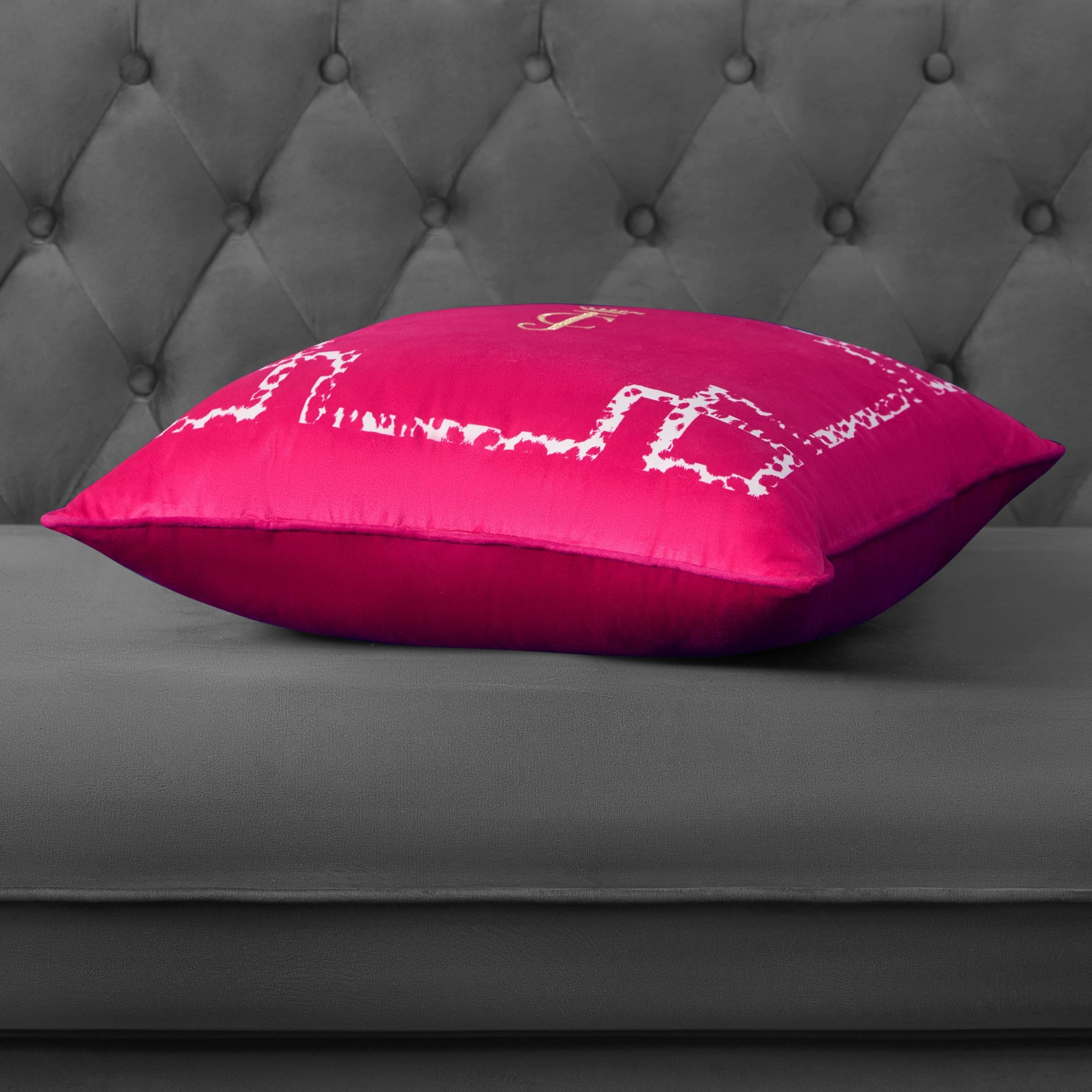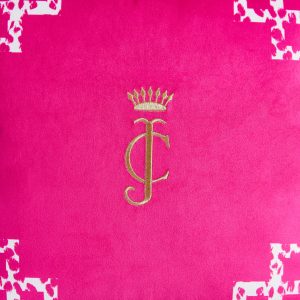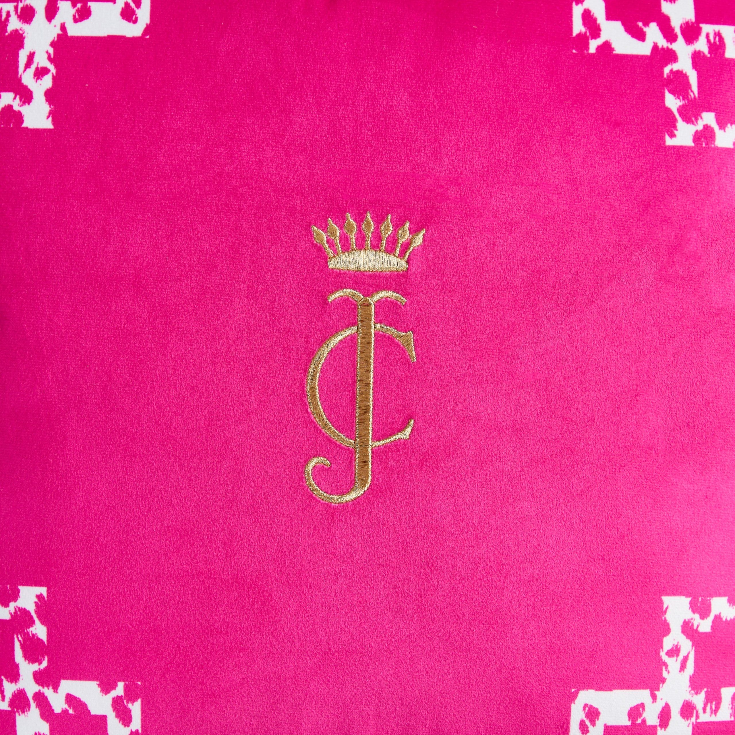 The sophisticated Juicy Couture Lattice Embroidered Velvet Throw Pillow will elevate any part of your home. This rich black pillow features a chic monochrome cheetah print lattice border. showcasing a regal JC logo embroidered in gold thread.