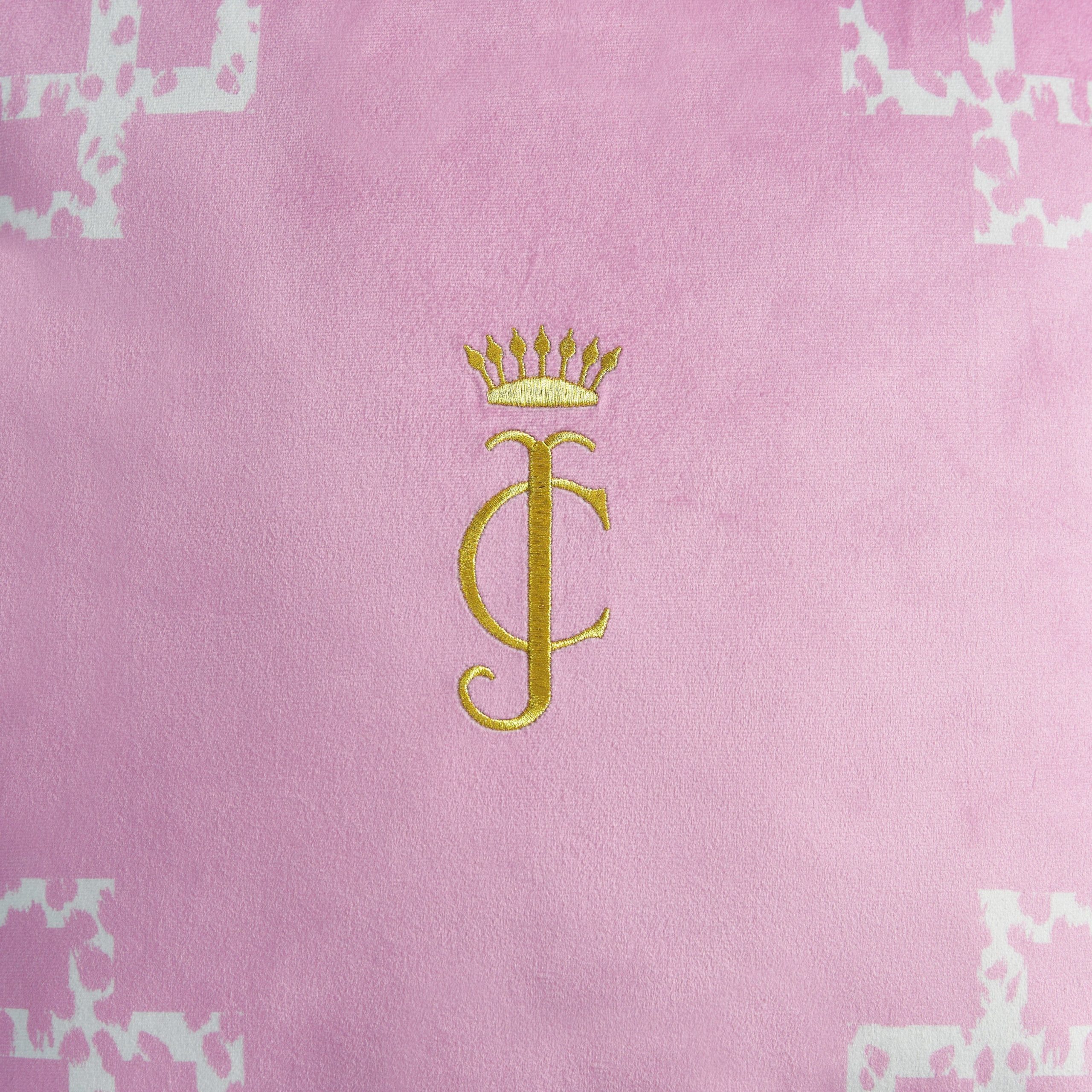 The sophisticated Juicy Couture Lattice Embroidered Velvet Throw Pillow will elevate any part of your home. This rich black pillow features a chic monochrome cheetah print lattice border. showcasing a regal JC logo embroidered in gold thread.